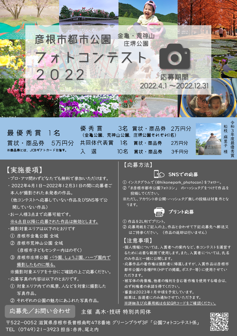 髙木・技研 特別共同体が管理する「金亀公園」、「荒神山公園」、「庄堺公園(バラ・しょうぶ・ハーブ園に限る)」で撮影された風景や人などを対象とした「彦根市都市公園フォトコンテスト2022」を今年も開催いたします!